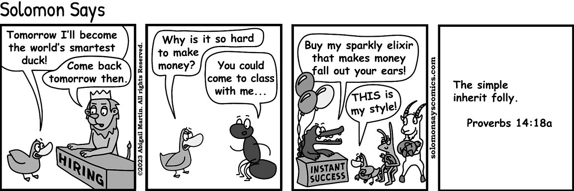SOLOMON SAYS is a fun way to teach biblical truth to children (and adults) of all ages! This bundle includes Vol. 1, 2, 3, and 4 for hundreds of Proverb comics! All your favorite SOLOMON SAYS characters are here for humorous and witty scenarios that illustrate lessons from the Book of Proverbs.